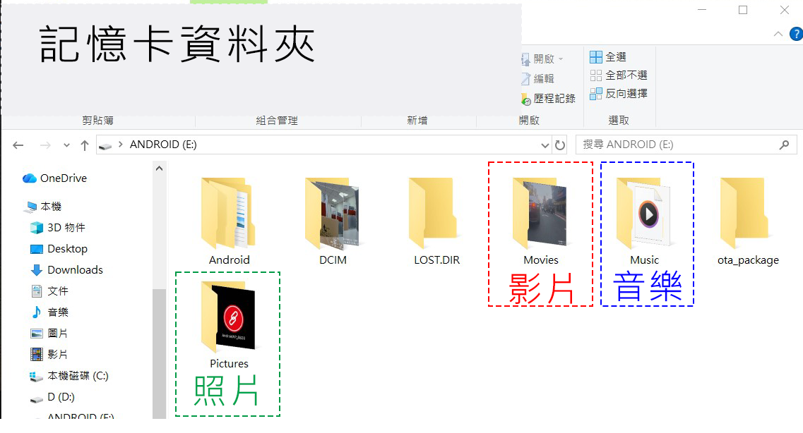 2.請將想要放入影片、音樂、照片依序放入框中各資料夾中